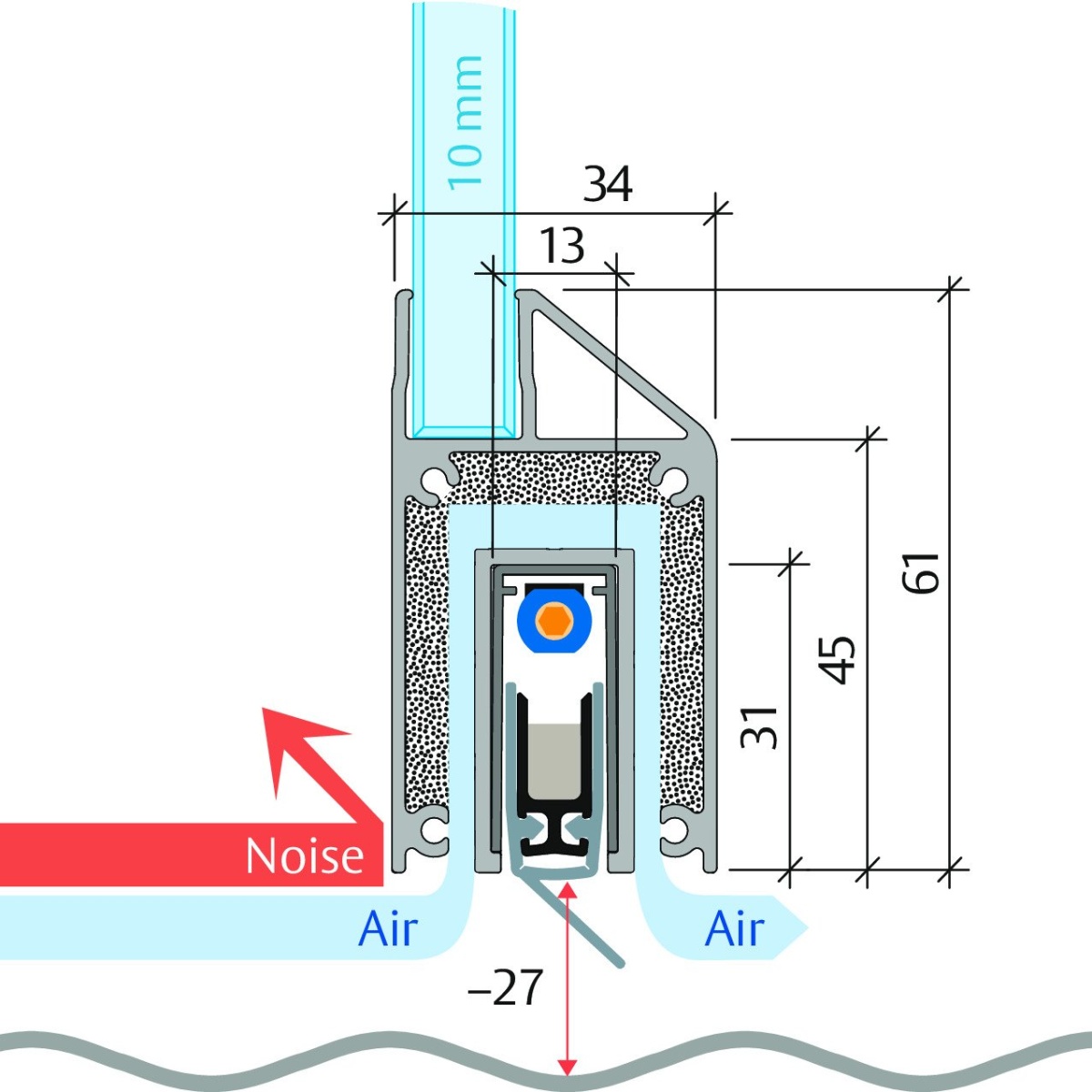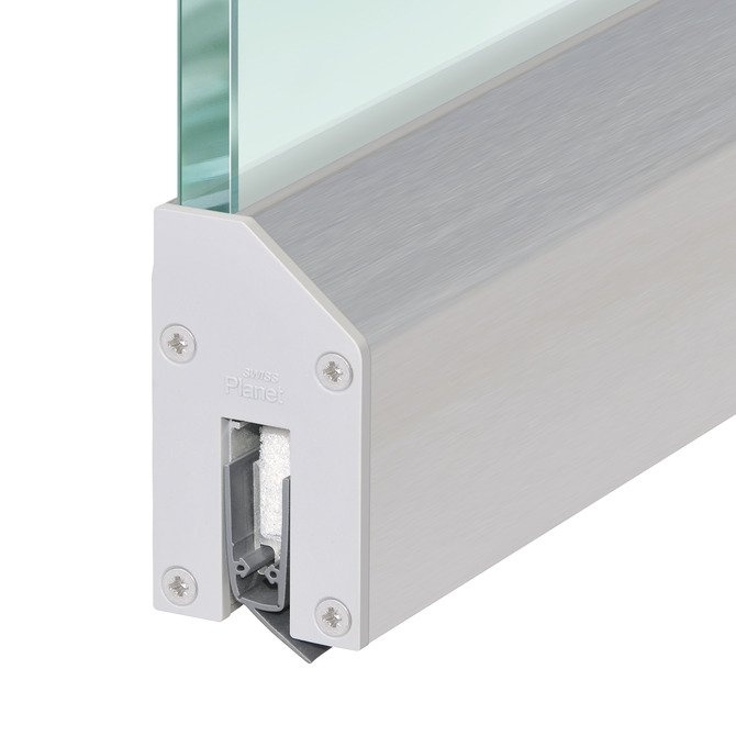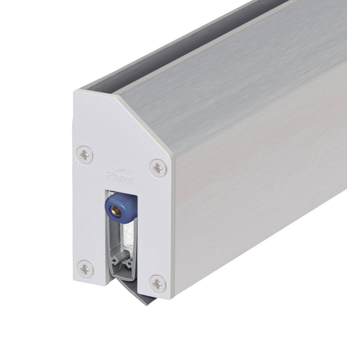 Automatické dveřní těsnění Planet KG-MinE-S10 | 27 dB pro zvukotěsné dveře ze skla s propustností vzduchu, pro rovné a nerovné podlahy, uvolnění na straně závěsu s automatickou kompenzací pro šikmé podlahy.Paralelní spouštění, výška těsnění až 27 mm, silikonové těsnění. Materiál elox nebo kartáčovaná nerez.