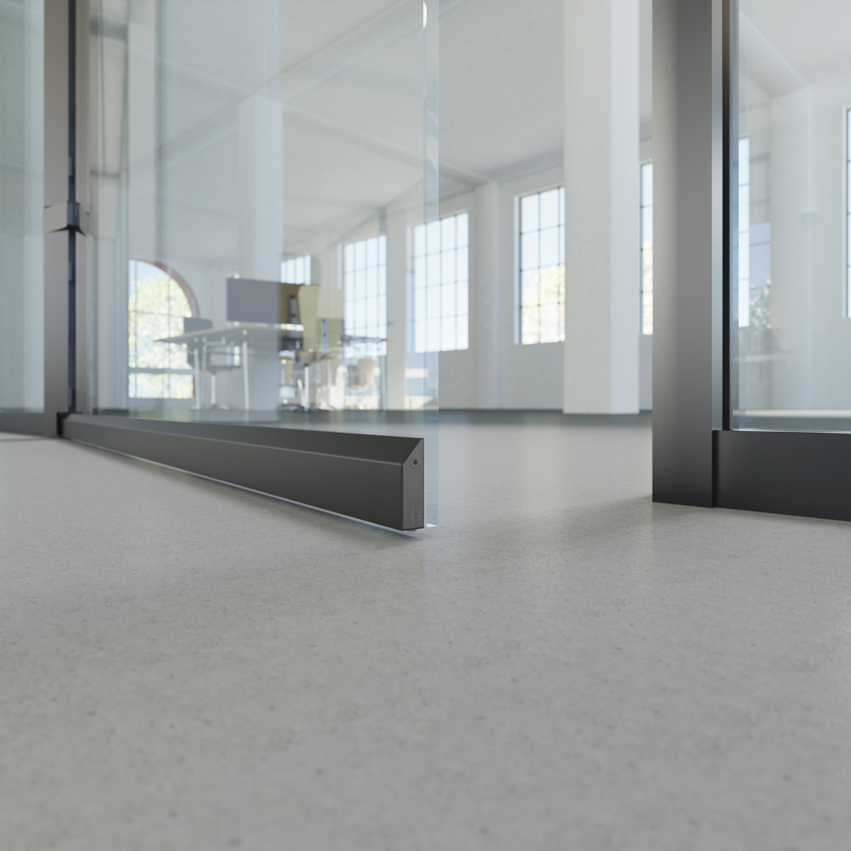 Automatické dveřní těsnění, vhodné pro protipožární a kouřotěsné dveře, jednostranný spouštěč s paralelním spouštěním a automatickou kompenzací pro šikmé podlahy, ochranný profil ve stříbrném eloxovaném provedení EV1, matné nerezové oceli nebo matně černém eloxovaném provedení C35, k nalepení na boční stranu.