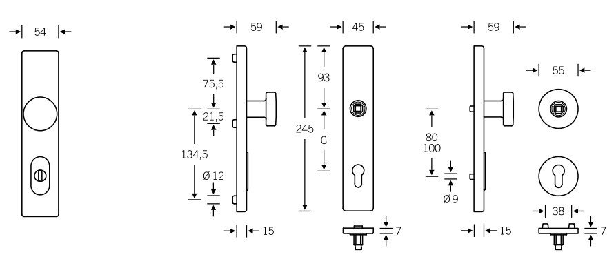 V ceně sady je kompletní vybavení: vnější štít s koulí nebo klikou, spojovací šrouby, čtyřhran + interiérová klika model FSB 1107. U bronzového kování je standardně klika FSB 1023.