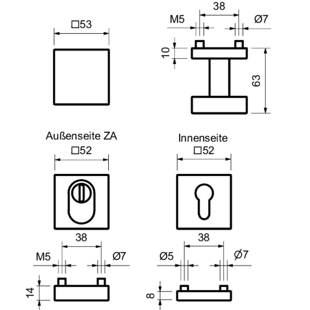 Sada kování pro vstupní dveře se čtvercovými rozetami a zámkovou rozetou s překrytím vložky.