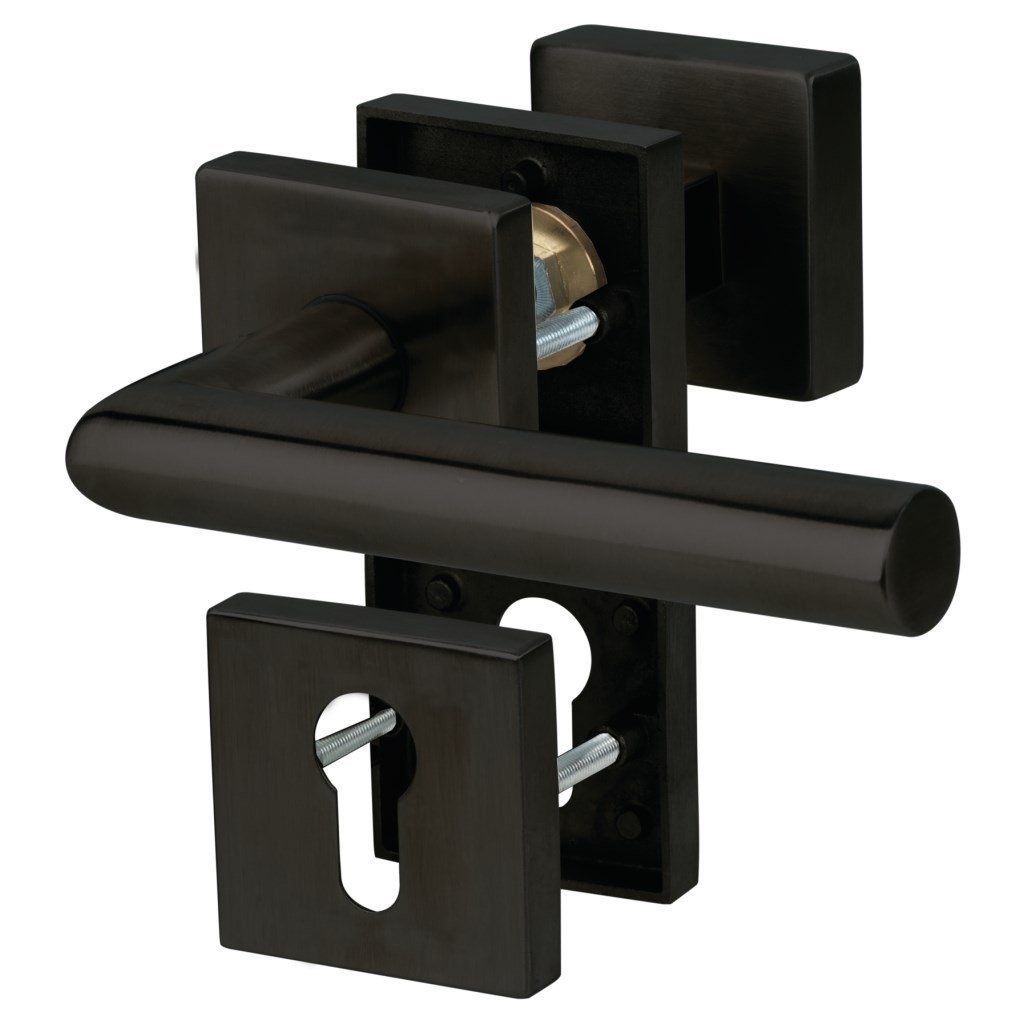 Sada kování pro vstupní dveře se čtvercovými rozetami a zámkovou rozetou s překrytím vložky.