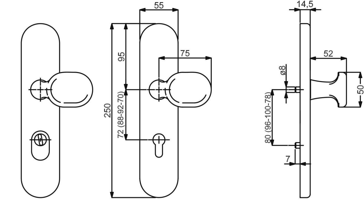 Při rozteči 92 mm je spoj. materiál pro tloušťku 67-72 mm, čtyřhran 10 mm. ( Jiná tloušťka nebo čtyřhran za příplatek 150,- )