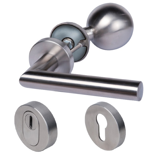 Bezpečnostní kování pro vstupní dveře s překrytím cylindrické vložky a vyosenou koulí