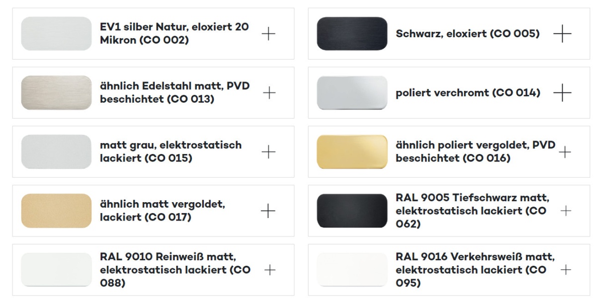 Některé speciální povrchové úpravy CO 016/CO 017/CO 015/CO 088/CO 095 nemusí být ve výrobě skladem a je vyžadován minimální objednací počet pro realizaci.
