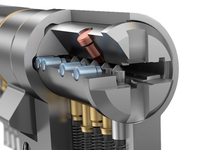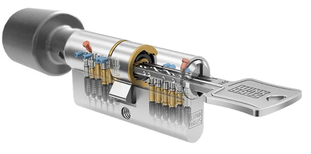 - prostupová spojka - při zabouchnutí dveří s klíči v zámku lze z druhé strany zasunout druhý klíč - např. vstupní dveře klika/koule