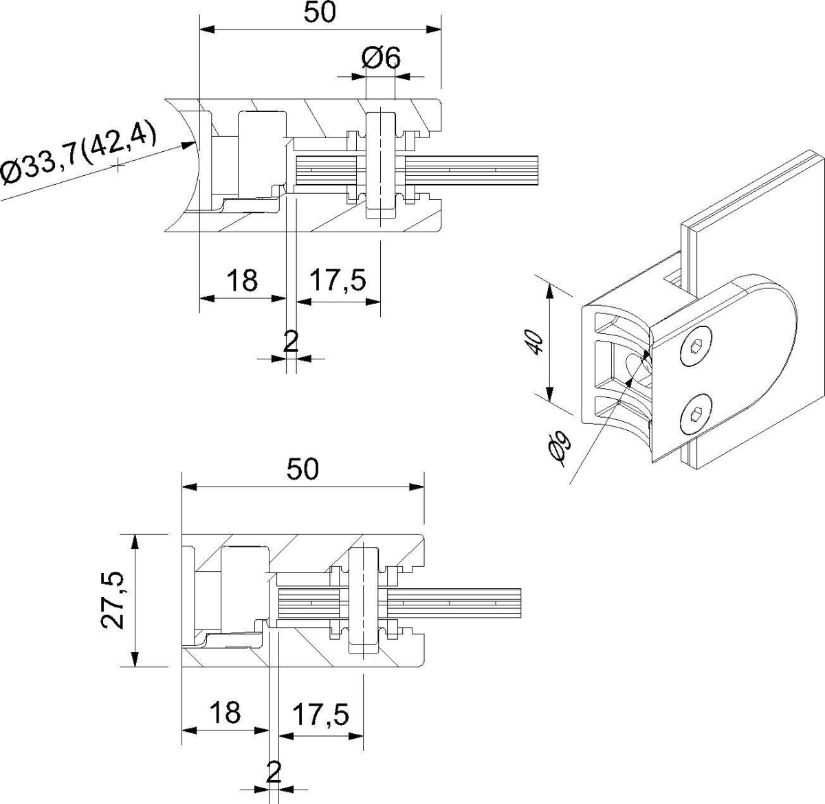 Držák skla AbP typ 3, 40x50mm, zinek bez povrchu 8 mm, Kulatý průměr 33,7 mm