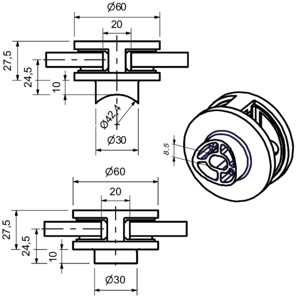 Držák skla naložený středový s montáží na plochu nebo trubku.