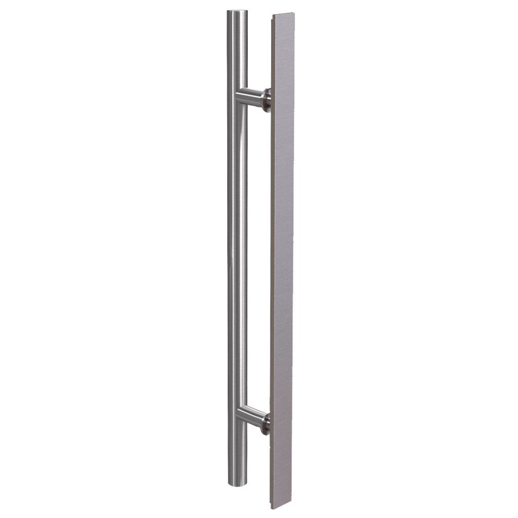 Z jedné strany je klasické madlo s výškou 45 mm. Z druhé strany plochý prvek nerez vzhled, který slouží k upevnění madla. Plochá část madla umožňuje posouvat dveřní křídlo v otevřené poloze zároveň se stavebním otvorem a průchod tak zůstává kompletní.