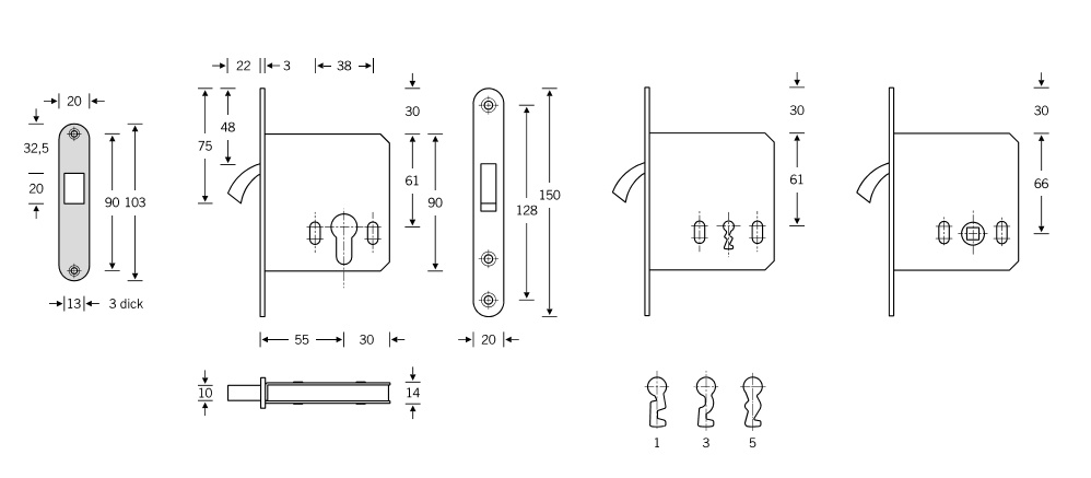 Zámek je dostupný ve verzi pro vložku, obyčejný klíč (1 kus klíče) a WC zamykání (8 mm ořech)