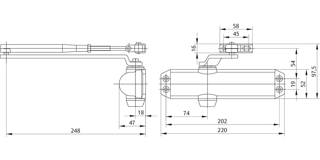 - dveřní zavírač s hřebenovou technologií a lomeným ramínkem