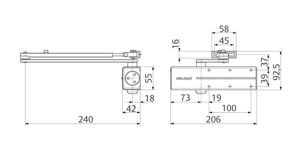 - dveřní zavírač s hřebenovou technologií a lomeným ramínkem