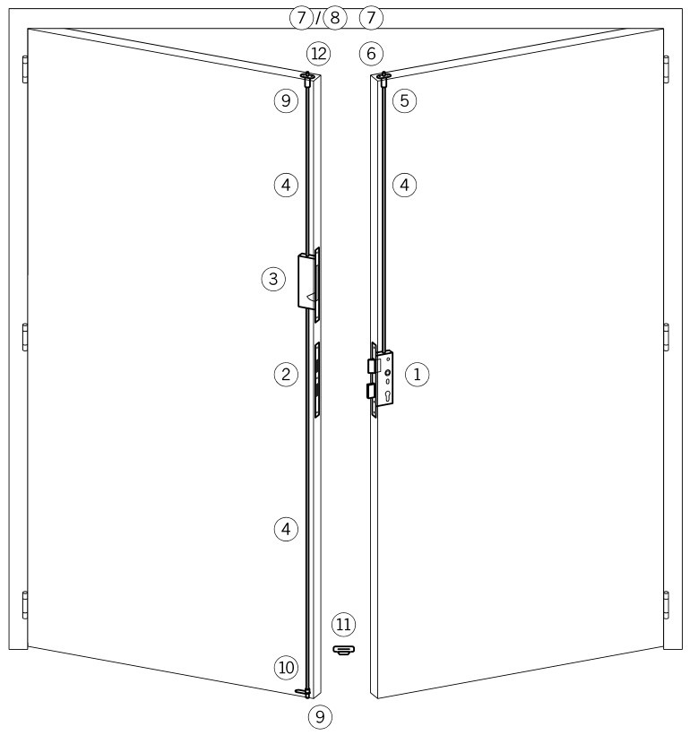 Funkce: Pro dvoukřídlové dveře s panikovou funkcí. Aktivní křídlo je ovládáno standardním panikovým zámkem SSF FH 61 pomocí kliky nebo hrazdy a je opatřeno horním táhlem pro vyšší stabilitu vysokých dveří. Doporučeno pro výšku křídla přes 2100 mm.