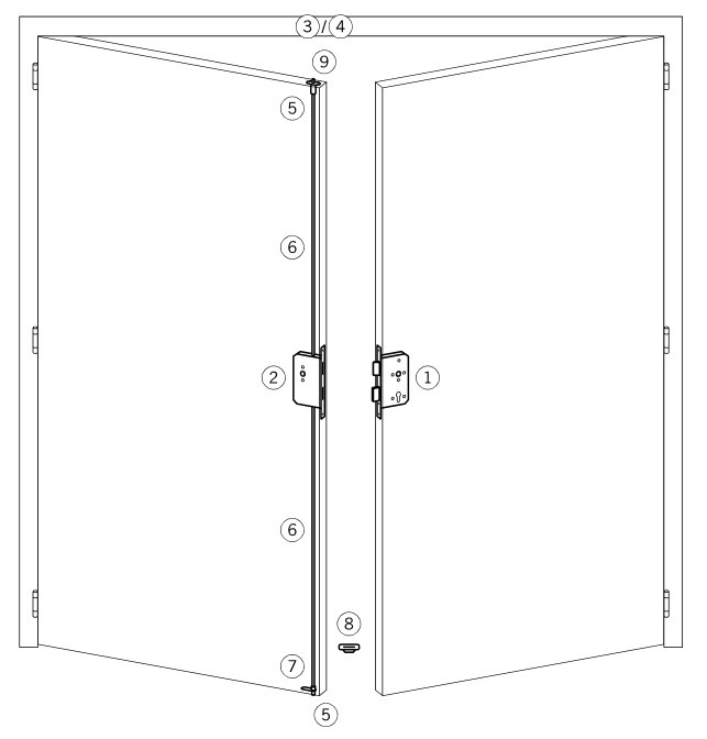 Funkce: Pro dvoukřídlové dveře s panikovou funkcí. Aktivní křídlo je ovládáno standardním panikovým zámkem SSF FH 62 pomocí kliky nebo hrazdy.