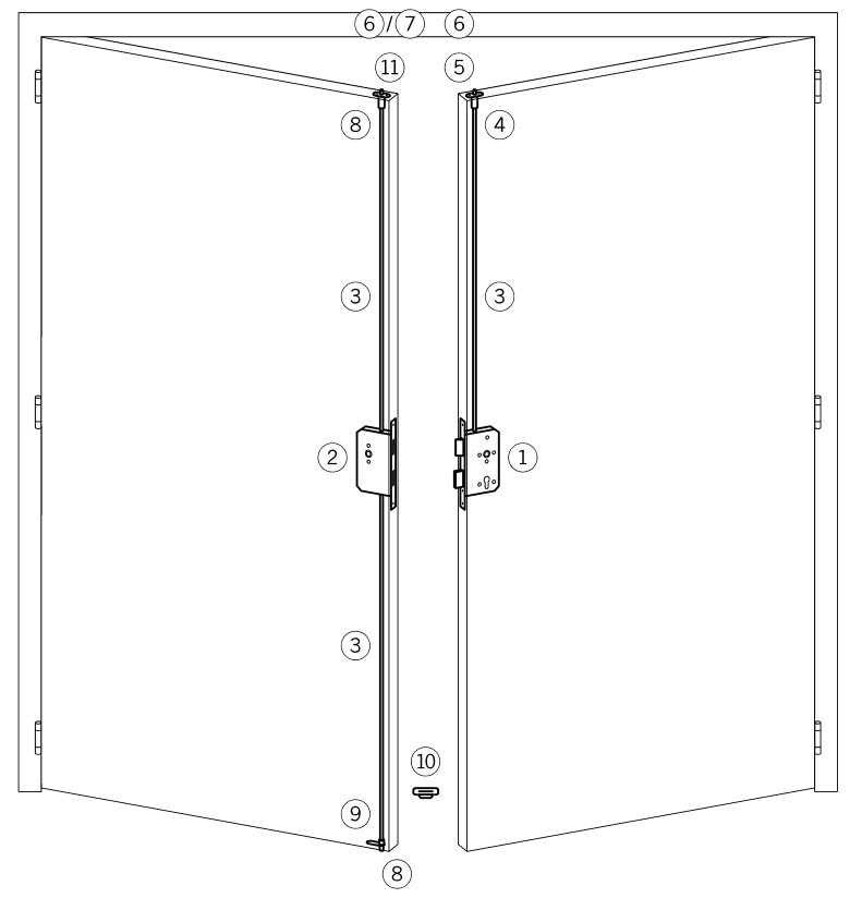Funkce: Pro dvoukřídlové dveře s panikovou funkcí. Aktivní křídlo je ovládáno standardním panikovým zámkem SSF FH 62 pomocí kliky nebo hrazdy. Pasivní křídlo je navíc vybaveno táhlem pro zajištění do horní části zárubně. Toto řešení se používá u dveří vyšších než 2100 mm.