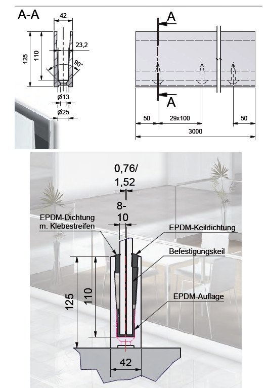 Ke tomuto profilu lze doložit statický posudek pro výšku skla až 1200 mm .