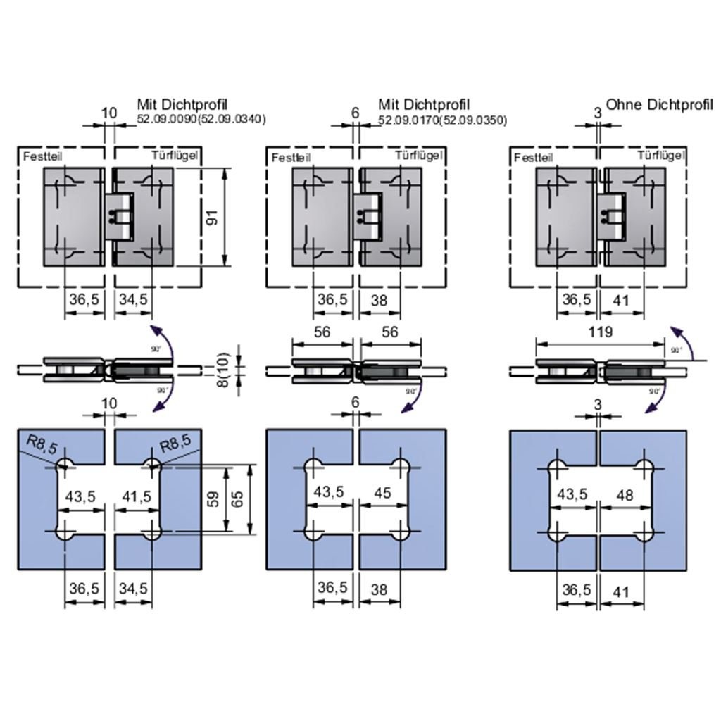 Montáž: sklo/sklo, úhel otevření 90° na obě strany