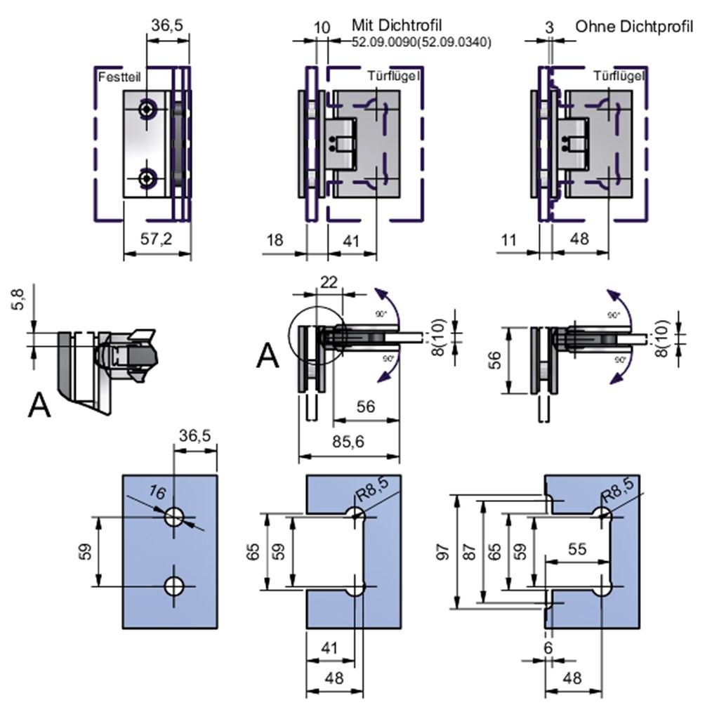 Montáž: sklo/sklo, úhel otevření 90° na obě strany