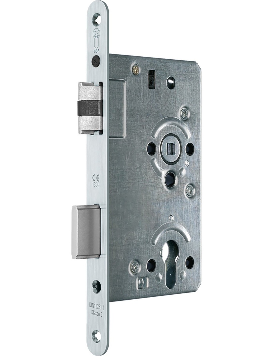 Zámek pro plné těžké objektové dveře umístěné v extrémně zatížených prostorech, střelka a závora vyosené, provedení pravolevé