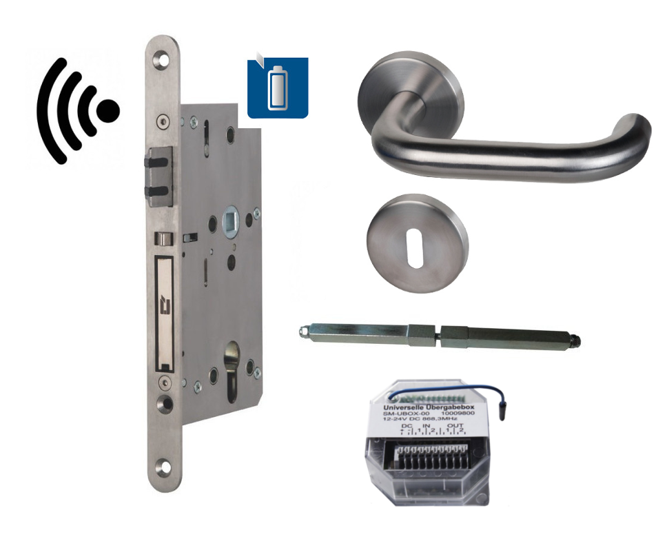 Univerzální řešení pro případy, kdy je potřeba instalovat do dveří panikový zámek s elektronickou kontrolou vstupu. Z vnitřní strany dveří lze dveře otevřít pouhým stiskem kliky. Vnější strana dveří je kontrolována elektronicky.