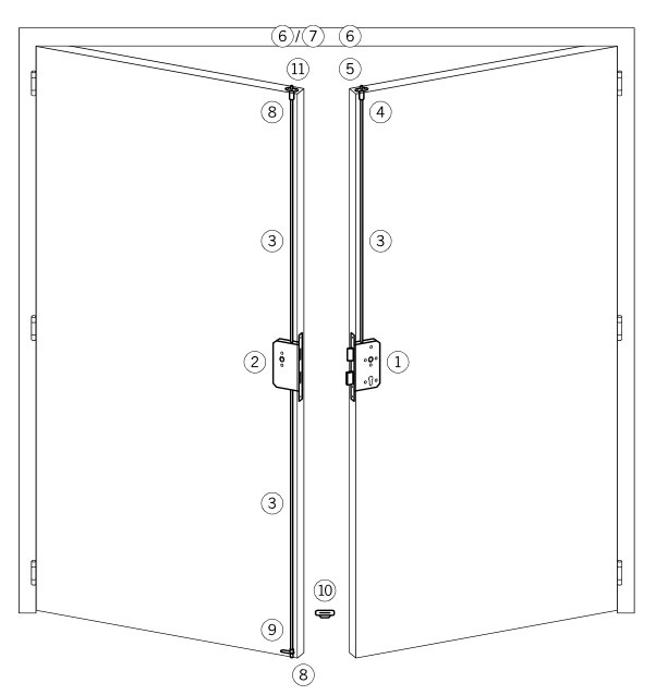 Zámek je vhodný pro aktivní dvoukřídlové dveře kdy požadujeme aby se otevřela obě křídla dveří najednou po stisknutí jedné kliky nebo hrazdy a aktivní křídlo bylo zajištěno ještě horním táhlem.