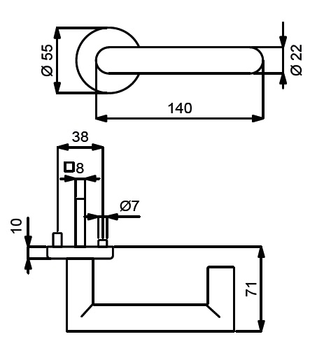 Sada kování obsahuje spojovací materiál a čtyřhran pro tloušťku dveří 38-42 mm.