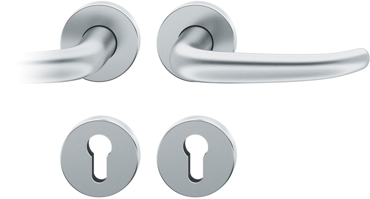 Kompletní sada kování pro požární dveře obsahuje pár dveřních klik, rozety pod kliku, rozety zámkové, spojovací materiál