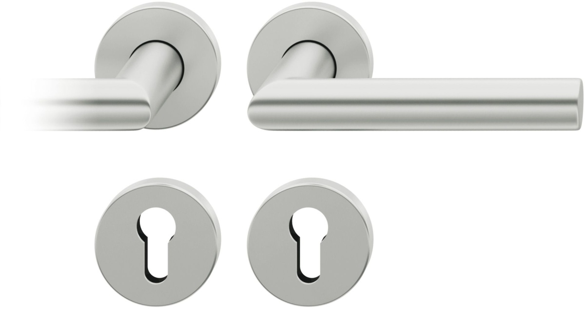 Kompletní sada kování pro požární dveře obsahuje pár dveřních klik, rozety pod kliku, rozety zámkové, spojovací materiál