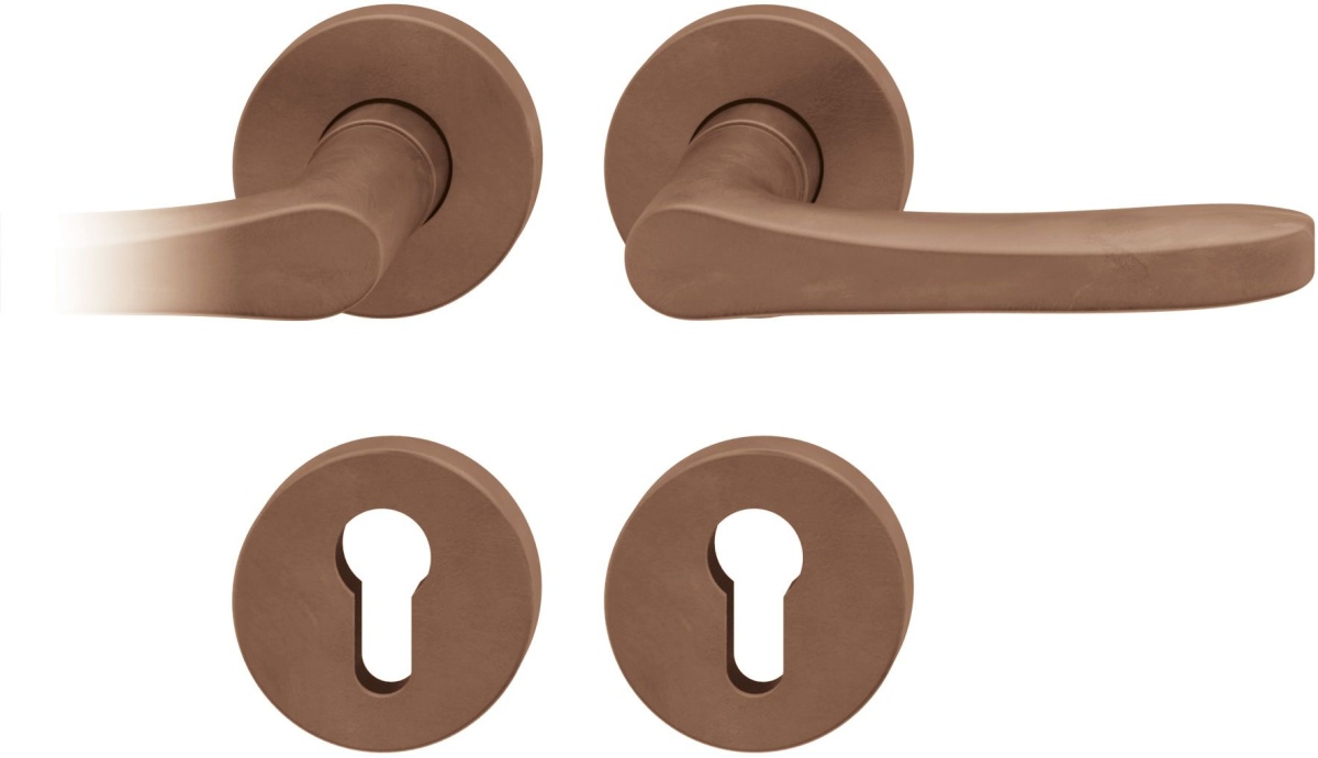 Kompletní sada kování pro požární dveře obsahuje pár dveřních klik, rozety pod kliku, rozety zámkové, spojovací materiál
