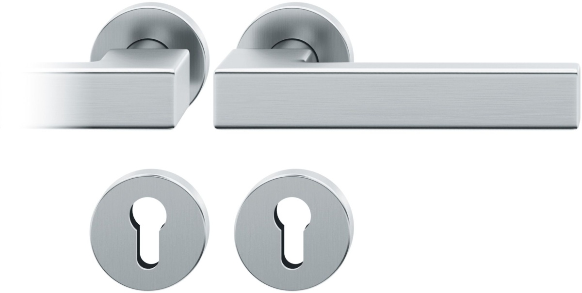 Kompletní sada kování pro požární dveře obsahuje pár dveřních klik, rozety pod kliku, rozety zámkové, spojovací materiál