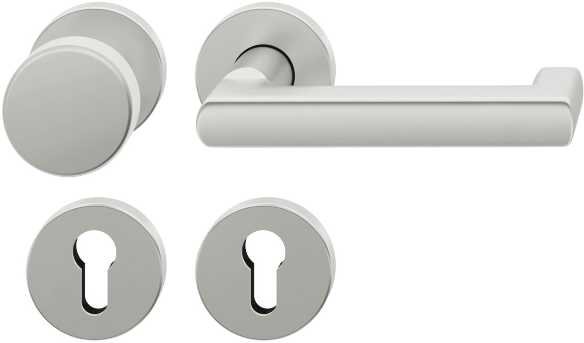 Kompletní sada kování pro požární a panikové dveře obsahuje pár dveřních klik, rozety pod kliku, rozety zámkové, spojovací materiál