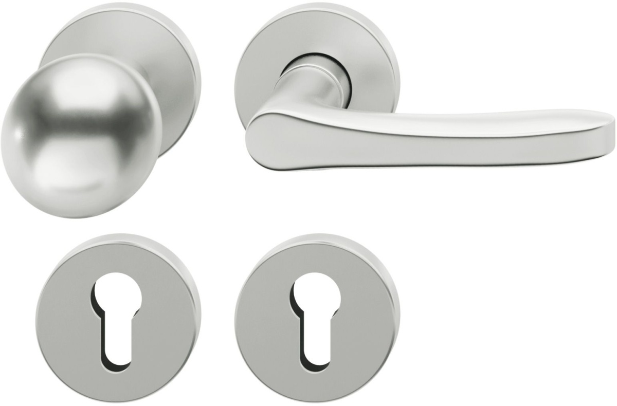 Kompletní sada kování pro požární a panikové dveře obsahuje pár dveřních klik, rozety pod kliku, rozety zámkové, spojovací materiál