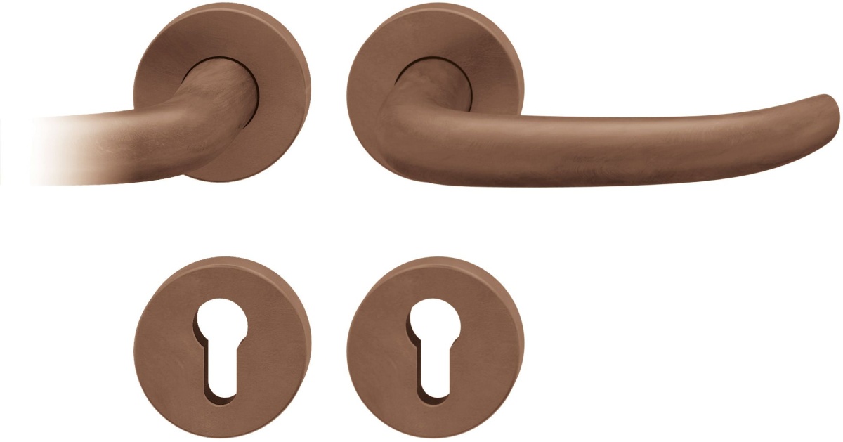 Kompletní sada kování pro požární a panikové dveře obsahuje pár dveřních klik, rozety pod kliku, rozety zámkové, spojovací materiál