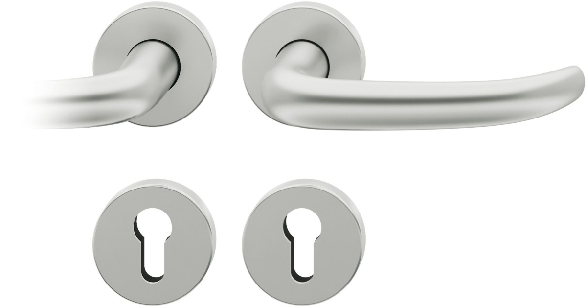 Kompletní sada kování pro požární a panikové dveře obsahuje pár dveřních klik, rozety pod kliku, rozety zámkové, spojovací materiál
