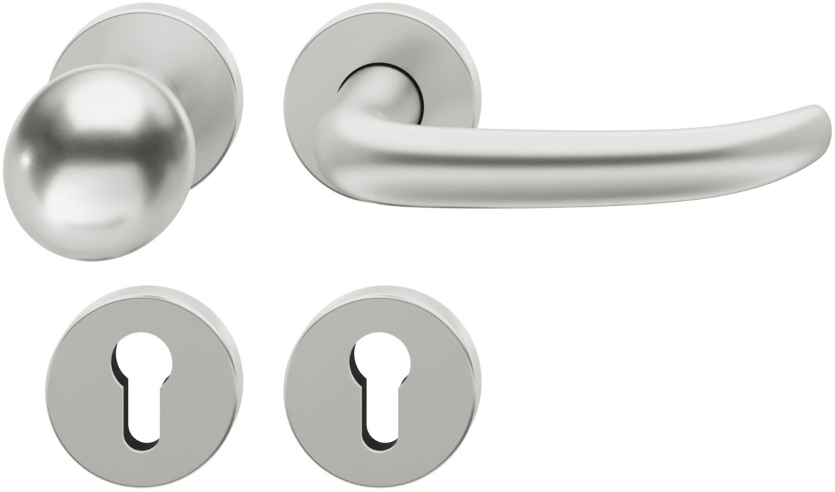 Kompletní sada kování pro požární a panikové dveře obsahuje pár dveřních klik, rozety pod kliku, rozety zámkové, spojovací materiál