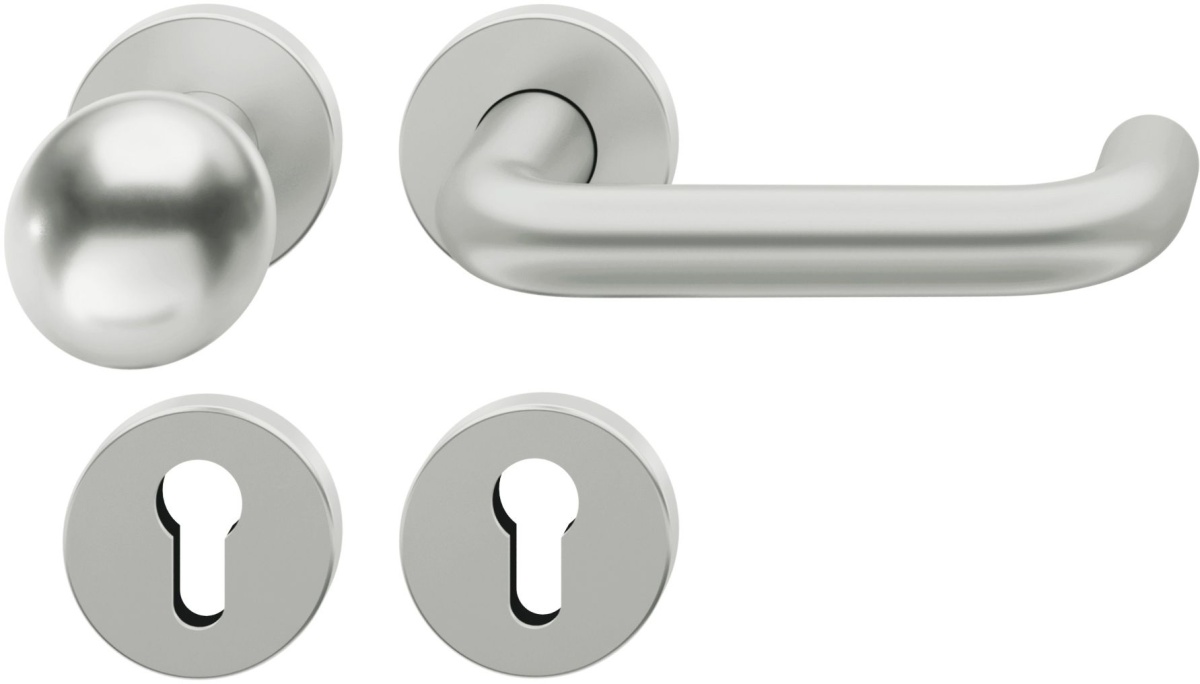 Kompletní sada kování pro požární a panikové dveře obsahuje pár dveřních klik, rozety pod kliku, rozety zámkové, spojovací materiál
