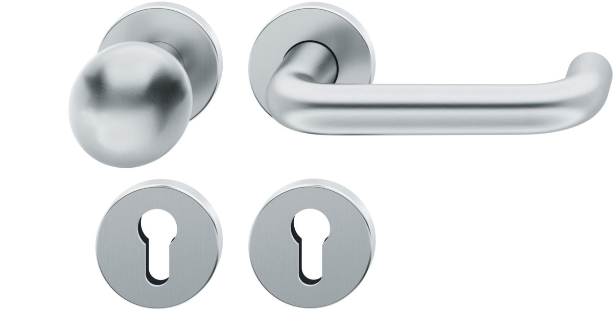 Kompletní sada kování pro požární a panikové dveře obsahuje pár dveřních klik, rozety pod kliku, rozety zámkové, spojovací materiál