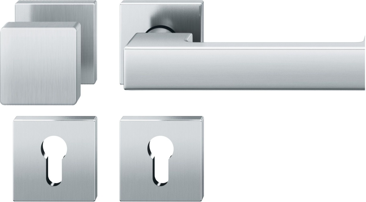 Kompletní sada kování pro požární a panikové dveře obsahuje pár dveřních klik, rozety pod kliku, rozety zámkové, spojovací materiál