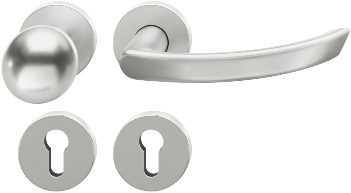 Kompletní sada kování pro požární a panikové dveře obsahuje pár dveřních klik, rozety pod kliku, rozety zámkové, spojovací materiál