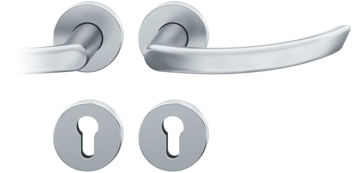 Kompletní sada kování pro požární a panikové dveře obsahuje pár dveřních klik, rozety pod kliku, rozety zámkové, spojovací materiál