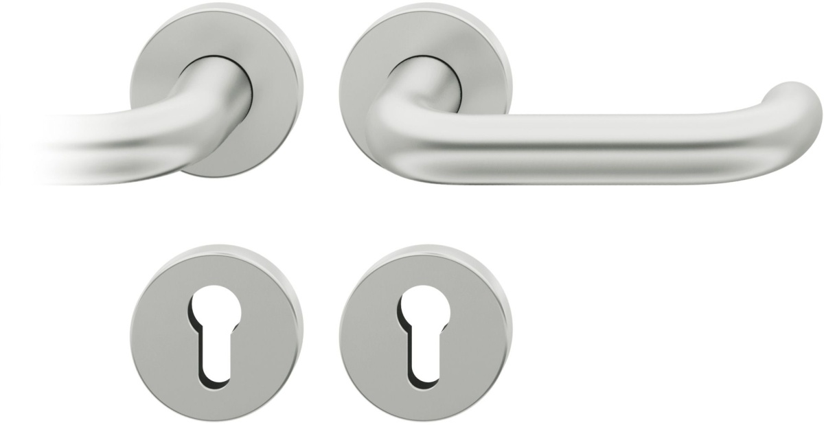Kompletní sada kování pro požární a panikové dveře obsahuje pár dveřních klik, rozety pod kliku, rozety zámkové, spojovací materiál