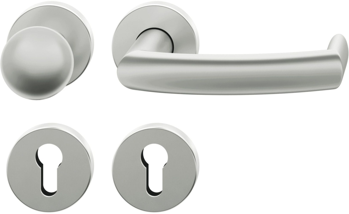 Kompletní sada kování pro požární a panikové dveře obsahuje pár dveřních klik, rozety pod kliku, rozety zámkové, spojovací materiál