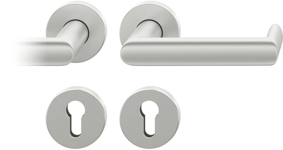 Kompletní sada kování pro požární a panikové dveře obsahuje pár dveřních klik, rozety pod kliku, rozety zámkové, spojovací materiál