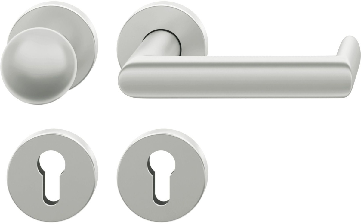 Kompletní sada kování pro požární a panikové dveře obsahuje pár dveřních klik, rozety pod kliku, rozety zámkové, spojovací materiál