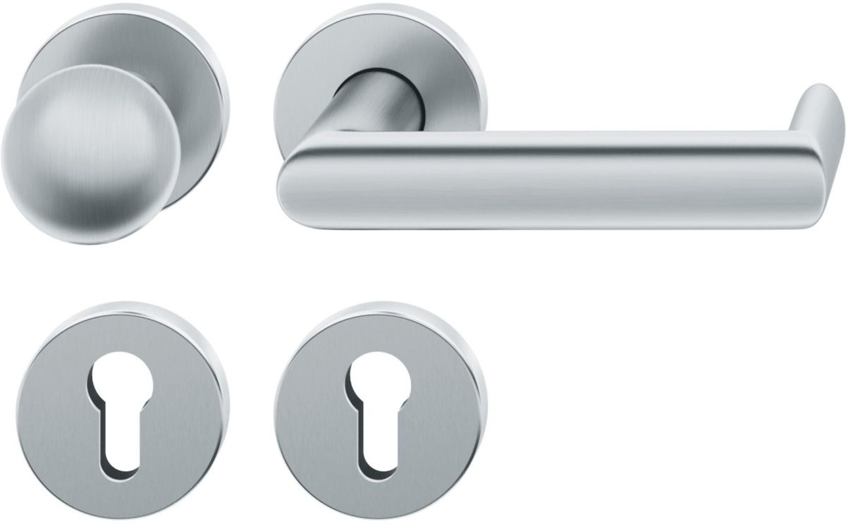 Kompletní sada kování pro požární a panikové dveře obsahuje pár dveřních klik, rozety pod kliku, rozety zámkové, spojovací materiál