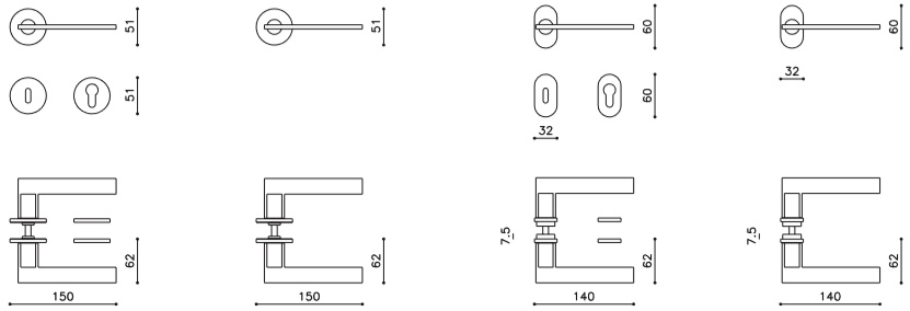Sada kování lze objednat také bez spodních rozet pro klíč nebo s WC kličkou.