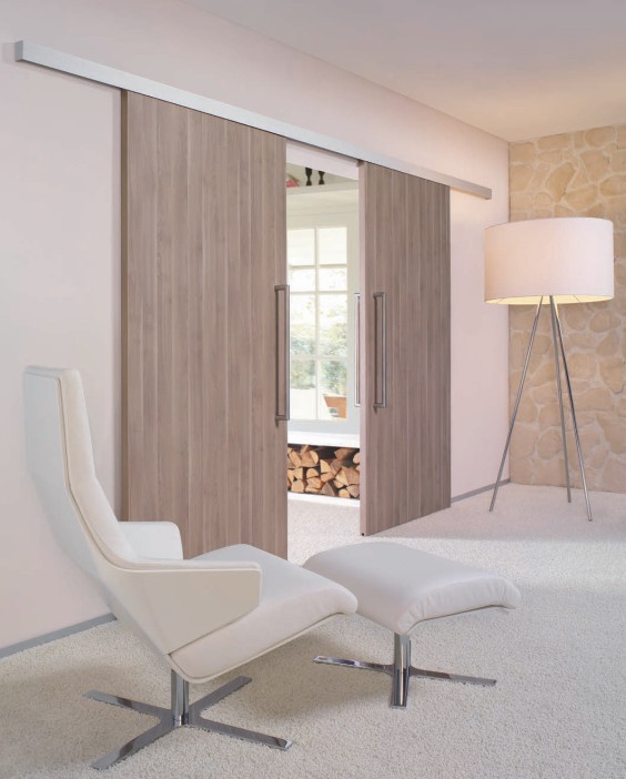 Lišta délky 1300/1700/2100/2500 mm pro max. šíři dveří 700/900/1100/1300 mm, 2x vozík s kolečky, 2x úchyt dveří, 2x automatický dojezd, 1x vodící element na zem pro dveře
