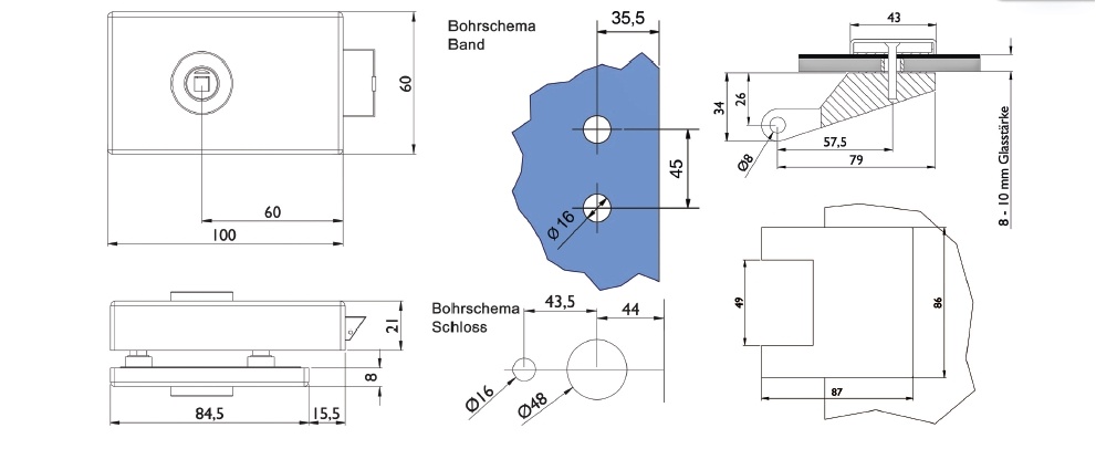 Kování je vhodné pro falcové dveře se šířkou falcu 24 mm, tloušťka skla 8-10 mm.