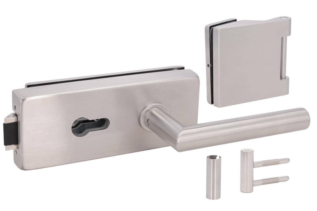 Kompletní sada kování pro skleněné dveře včetně integrovaného zamykání