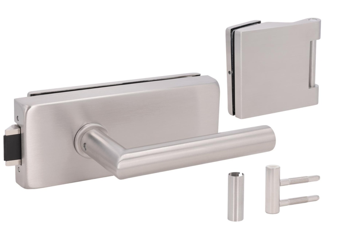 Kompletní sada kování pro skleněné dveře včetně integrovaného zamykání