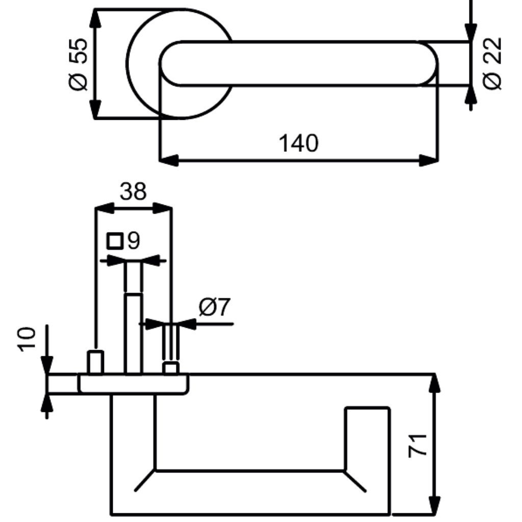 Sada kování obsahuje spojovací materiál a čtyřhran pro tloušťku dveří 38-42 mm.